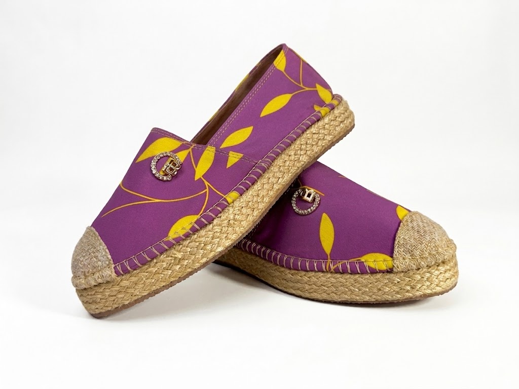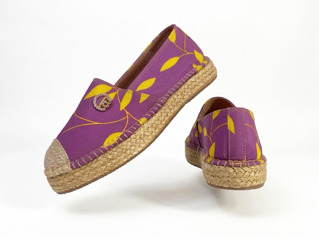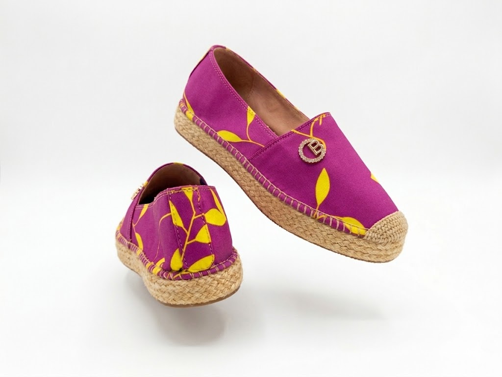 Diseñado para la mujer contemporánea que valora la elegancia orgánica, el Espadril Amara es una declaración de estilo natural y refinado. Este modelo destaca por su base de lona en un tono fucsia vibrante, sobre la que resalta un nítido y detallado patrón botánico amarillo, evocando la frescura de los días de sol. La silueta clásica de alpargata se actualiza con una plataforma de yute tejido de altura media, ofreciendo una elevación cómoda, estilizada y artesanal. El broche circular central, incrustado con cristales brillantes, añade un destello de lujo que eleva la simplicidad del diseño sin perder su esencia relaxed. Perfecto para un brunch junto al mar o un paseo por la ciudad, el Espadril Amara aporta un toque de alegría y sofisticación refined luxury a cualquier look de verano.