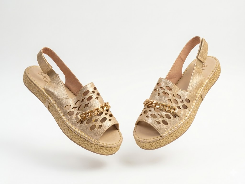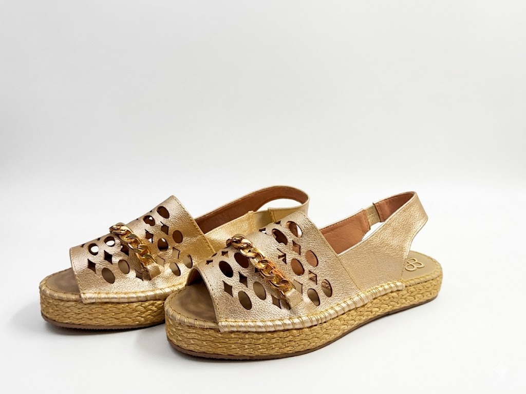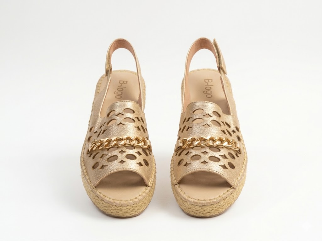 Redefina su calzado de temporada con una pieza que equilibra audacia y sofisticación. La espadrille sandalia Aureum destaca por su silueta de inspiración clásica, elevada mediante un exquisito acabado en piel metalizada con textura micro-perforada de diseño geométrico. El punto focal reside en su imponente herraje de cadena dorada sobre el empeine, aportando un carácter arquitectónico y lujoso. Montada sobre una plataforma de yute natural que garantiza una pisada equilibrada, esta sandalia es la solución definitiva para quienes buscan un estilo funcional que no sacrifica la elegancia. Ideal para elevar un conjunto de lino o aportar una nota de luz a estilismos monocromáticos, proyectando una imagen impecable y decididamente moderna.
