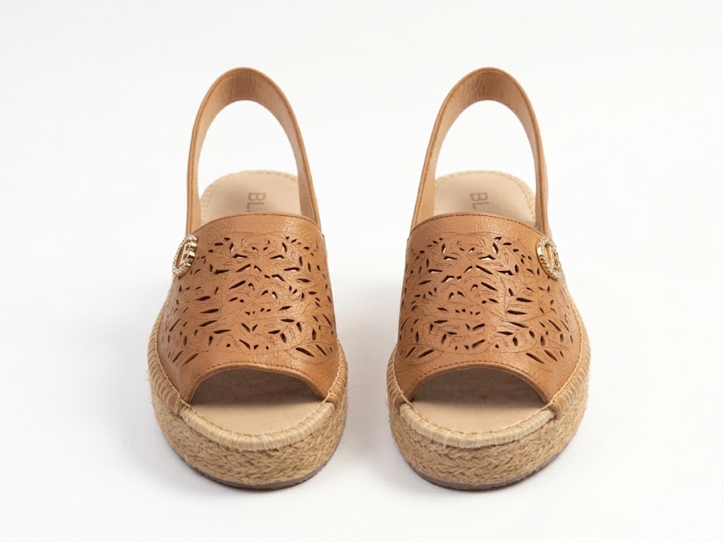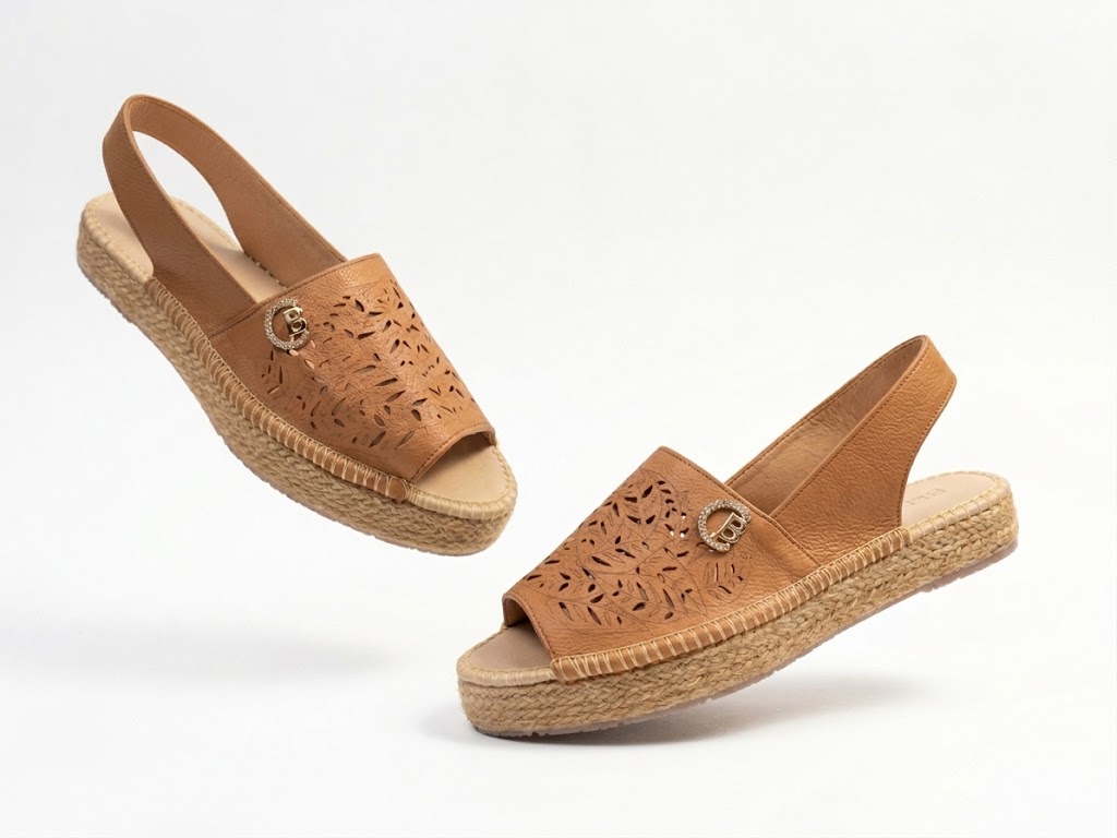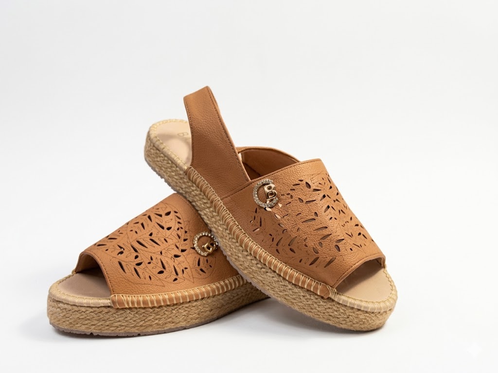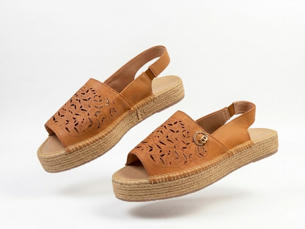 Sofisticación natural en cada paso. La espadrille sandalia destalonada Lucía redefine el concepto de effortless chic. Confeccionada en una exquisita piel de tono miel, destaca por su refinado patrón de troquelado floral que aporta delicadeza, frescura y una textura visual única. El icónico herraje circular con incrustaciones de cristales añade un toque de brillo sutil y elegancia contemporánea, elevando la silueta instantáneamente. Montada sobre una plataforma de yute trenzado artesanalmente, este diseño peep-toe con tira trasera ofrece el equilibrio perfecto entre comodidad premium y estilo versátil, ideal para transicionar de una mañana de paseo a una cena al atardecer con total naturalidad. Un clásico veraniego elevado para la mujer moderna que valora el diseño detallado y la artesanía.