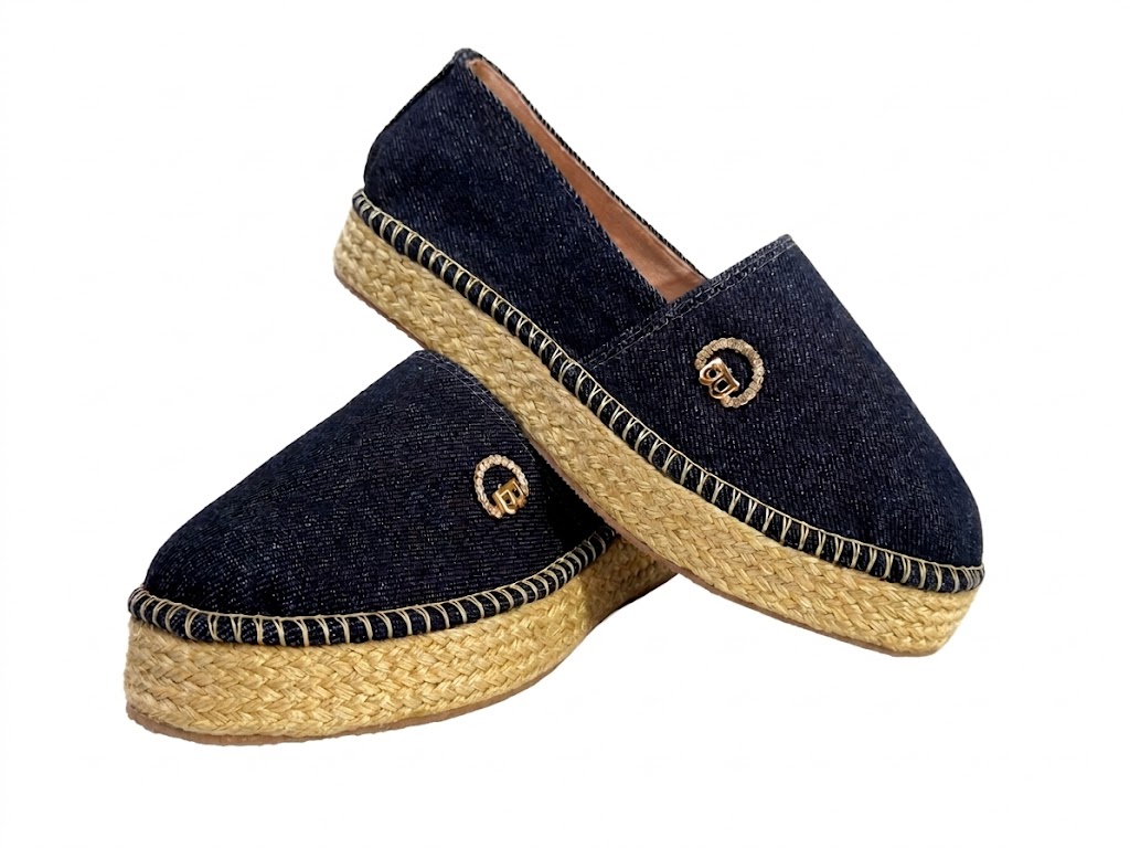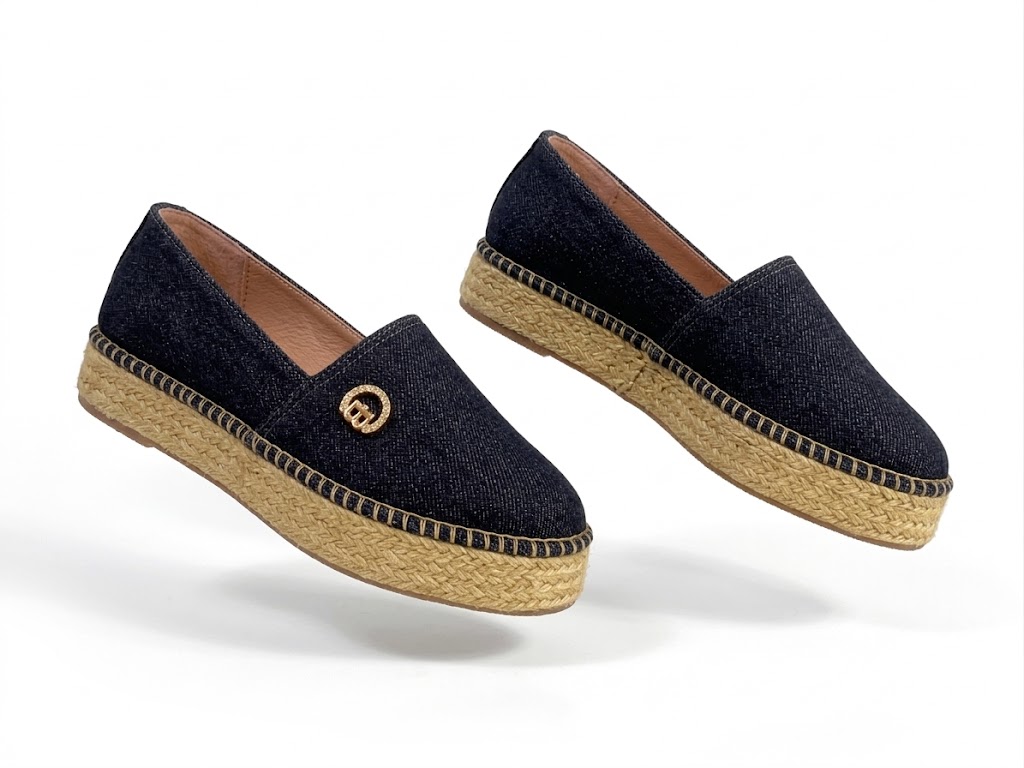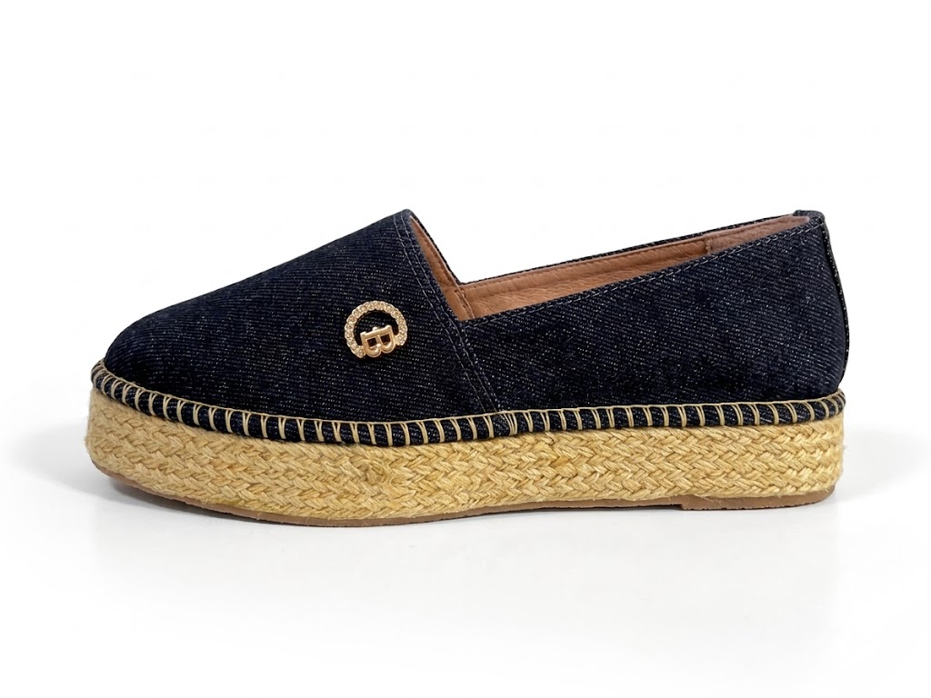 Nuestras espadrilles de la línea Contemporary Denim representan el equilibrio perfecto entre la estructura urbana y la frescura mediterránea. Confeccionadas en un denim índigo profundo de textura impecable, este modelo destaca por su silueta de plataforma plana que ofrece altura sin sacrificar la estabilidad. El detalle protagonista es su herraje circular con monograma “B”, delicadamente ornamentado con cristales, que aporta un destello de exclusividad a cada paso. La suela de yute trenzado, terminada con una costura artesanal visible, refuerza su ADN orgánico y sofisticado. Es la pieza definitiva para transicionar de un brunch de fin de semana a una tarde de resort con absoluta elegancia.