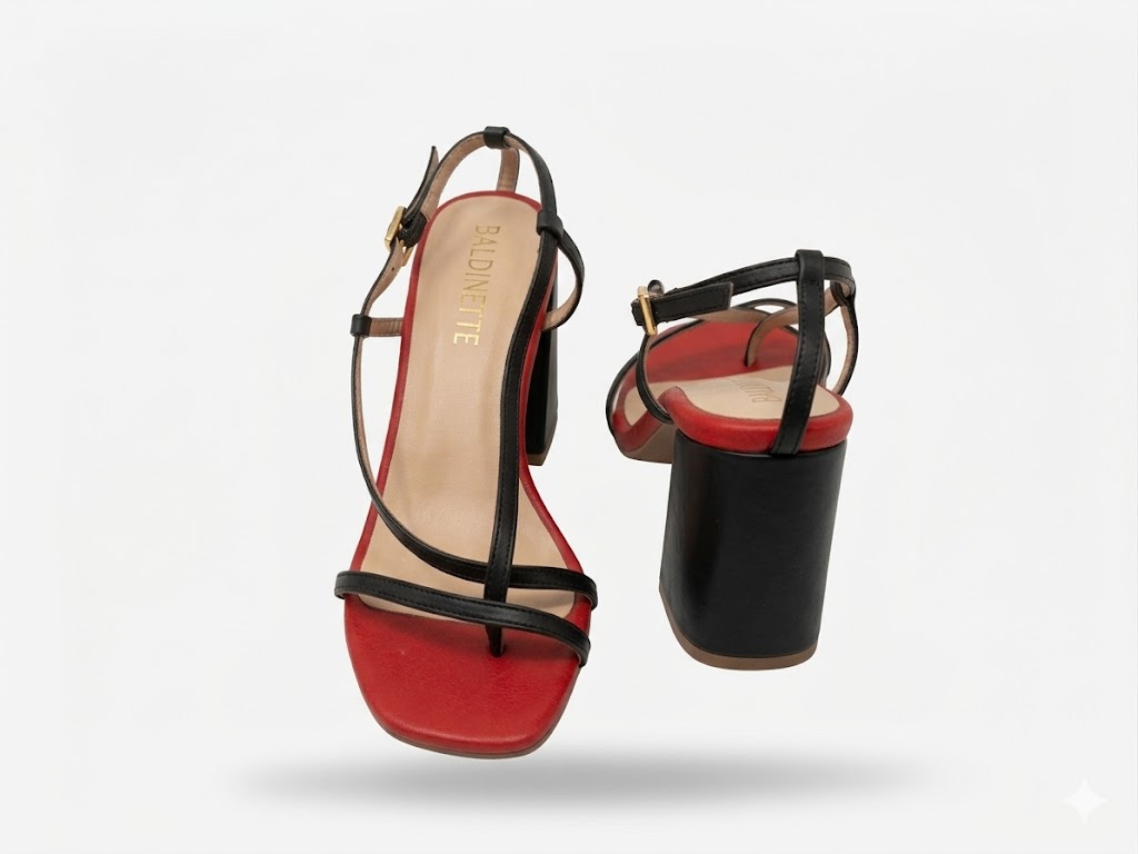 - Diseño gráfico en contraste: correas y tacón negros sobre base roja.