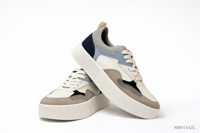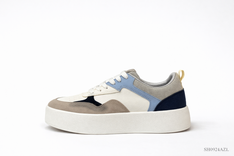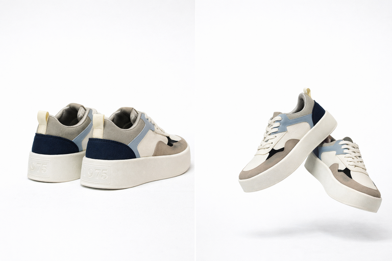 La combinación de tonos fríos y neutros crea un balance perfecto entre suavidad, estructura y versatilidad. Sus contrastes en azul, gris y crema aportan profundidad visual, mientras la plataforma robusta le da presencia y comodidad en cada paso.