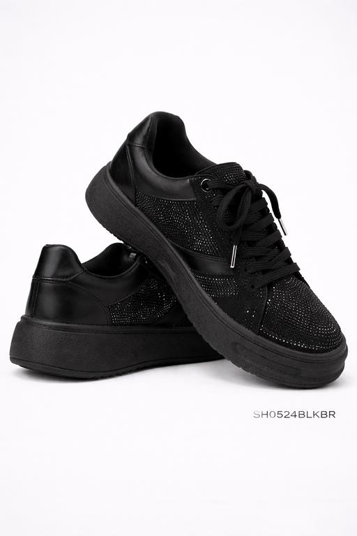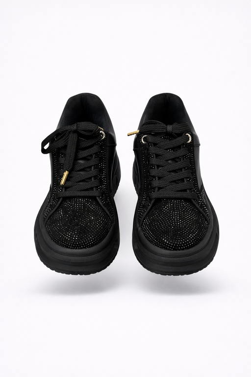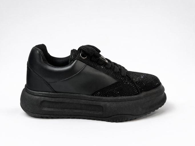 Sneaker de plataforma en tono negro con acabado sofisticado y detalles de brillo que elevan cualquier look. Su diseño combina textura, volumen y un toque glam sutil, ideal para quienes buscan comodidad sin perder presencia.