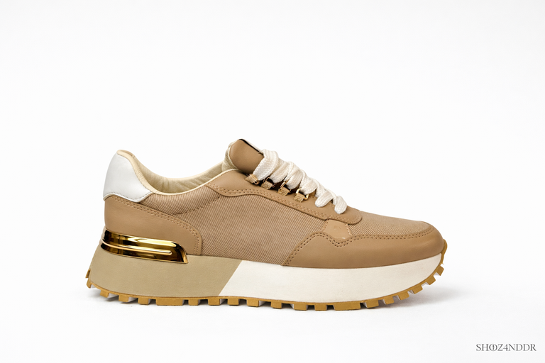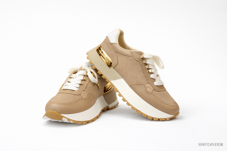 La plataforma con detalle metálico dorado eleva el diseño y le da una presencia refinada, mientras su construcción cómoda la convierte en una pieza ideal para acompañar looks casuales, pulidos y femeninos con un aire moderno.