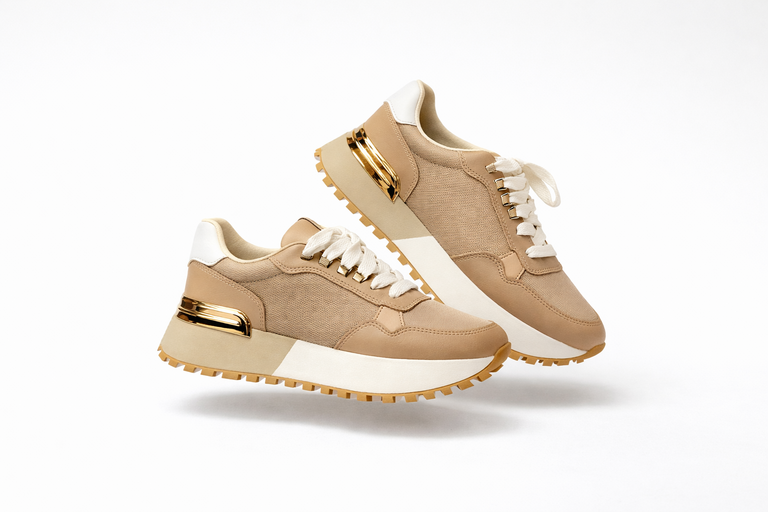 Una silueta sofisticada y atemporal que combina tonos neutros con acentos dorados para un acabado elegante, limpio y contemporáneo. Su mezcla de texturas en nude, beige y marfil aporta equilibrio visual, delicadeza y versatilidad.