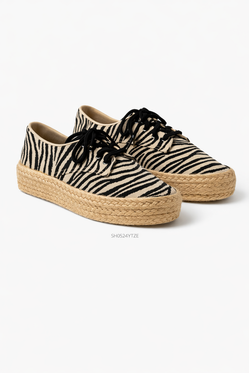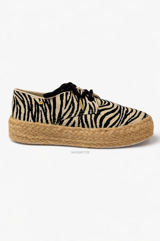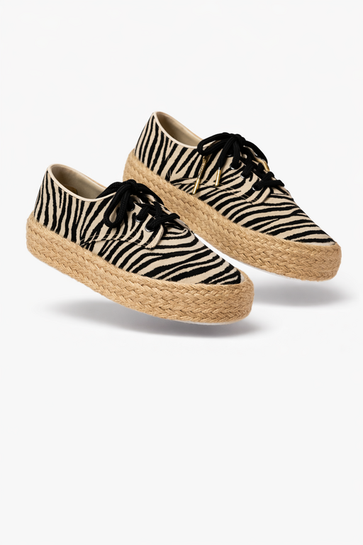 Este tenis combina un estampado zebra en contraste con una silueta casual de inspiración resort, creando una pieza moderna, versátil y con mucha personalidad. Su plataforma forrada en yute aporta un aire artesanal y elevado, mientras que los cordones negros y los detalles metálicos añaden un acabado más pulido y contemporáneo.
